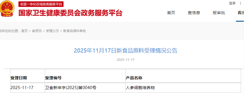1 | 2025-11-17 | 卫食新申字(2025)第0040号 | 人参细胞培养物 |